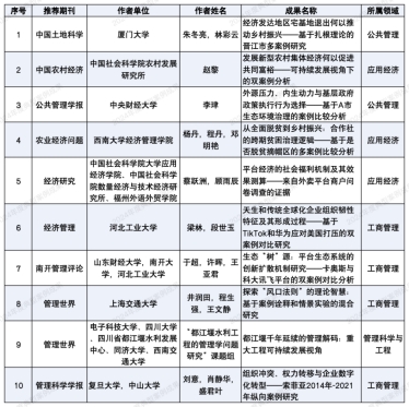 教育部学位与研究生教育发展中心持续开展典型案例成果遴选,旨在更好发挥高水平案例成果的示范引领作用。案例研究典型成果由中国案例研究期刊联盟推荐遴选。中国案例研究期刊联盟成立以来,26家成员单位相继开设案例研究专栏、开展案例研究探讨、推动案例研究论文发表。2023—2024年度共发表340余篇案例研究成果。经期刊联盟推荐、专家评议、案例专家委评议、案例专家委主任办公会审定等环节,从中遴选出10个案例研究典型成果,领域涵盖应用经济、公共管理、工商管理、管理科学与工程。本年度公共管理领域共有两篇论文入选。