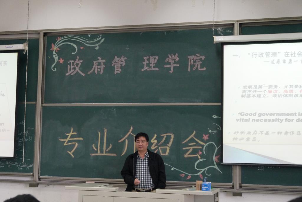 会议开始时行政管理系主任施青军教授上台发表了重要讲话。施教授从行政管理专业的发展前景入手,向同学们做了深入介绍。他指出,当代的社会,是一个经济飞速发展的社会,是一个面临行政体制改革的社会,而行政管理专业则是正中其下怀的专业之一。最后,他总结道,行政管理的未来是光明的,是无限的。这句话使在场的很多踌躇着不知道未来方向的同学顿时安了心,并开始憧憬自己的未来。