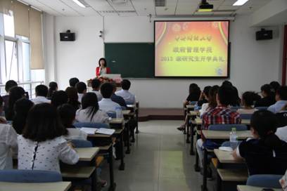 9月11日下午,2013级研究生新生开学典礼在中财大厦二层热烈举行。会上,赵景华院长回顾了学院的发展历程,详细介绍了学院的师资水平和学科建设情况。在院长谈治学环节,赵院长与13级新生分享了自己的求学经历,回顾了自己学术研究的几个关键时点,举例讲解了他本科与研究生阶段的求学方法,重点强调了“高、深、比、实、戒”的治学理念,对新生们提出殷切希望和严格要求。同时,赵院长也对新生的“为人之道”提出了希望,获得了新生的广泛认同。学院党总支书记吕丽老师围绕着“探究新问题、获取新方法、创造新知识”畅谈了自己的看法,亲切叮嘱新生明辨是非追求大爱。明确要求学生朝着正确的方向努力,争做表率力求栋梁,实现对国家负责、对社会负责、对父母负责、对自己负责的使命。两位师长的精彩发言获得了新生们的阵阵掌声。学院博士生代表、MPA代表和新生代表纷纷发言,畅谈理想,表明决心,典礼活动在热烈的气氛中落下帷幕。