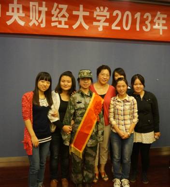 欢送会第一个环节便是雷媛同学作为一名新兵发表自己的感想与希冀。身着一袭迷彩军装的她,显得那么精神与自信,充满了力量。同时,她也表现出一向的沉着与从容,落落大方。雷媛同学首先表达了自己对中财这个大家庭一年来给予自己关爱的衷心感谢,也传达了内心渴望回报学校、让学校以她为荣的愿景。现场观众都能从她的真挚话语中,深切感受到一种侠骨柔情——渴望报效祖国的言语展现她巾帼不让须眉的豪情壮志;温婉淡雅的表情又让现场感受到女兵的飒爽英姿。那一刻,所有人都被这种富有激情而又充满温暖的场面打动了。