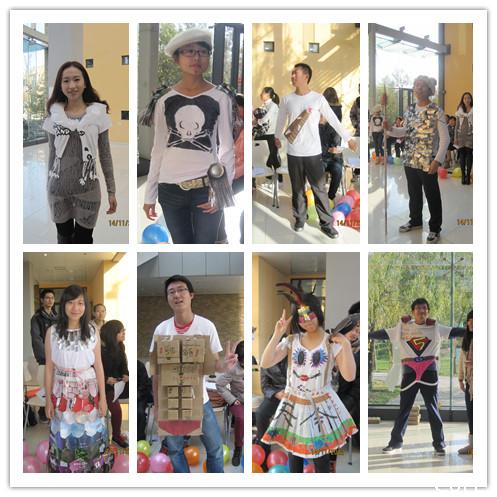 有了上个环节的铺垫,旧物改造环节让现场气氛更加活跃起来。每队模特身着由报纸、塑料瓶、塑料袋、易拉罐、纸箱改造的T恤服装逐次登上T台进行展示。尽管是些废弃物,但在团队合作下,在一双双巧手的制作中,每件作品都极具特色,也都获得了大家的肯定与好评。一时间,模特们成为了舞台的焦点,同学们也因此将环保这一概念更加具象化,并将在以后运用于生活之中。