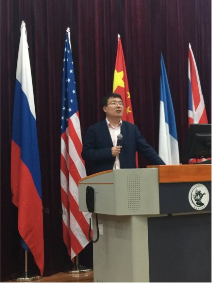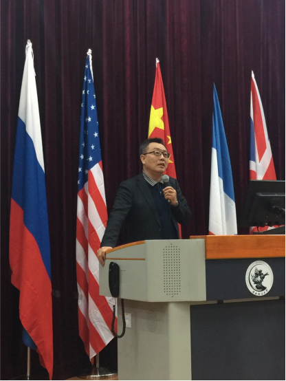 开幕式上,副校长孙国辉教授发表致辞。孙国辉副校长围绕十九大及高校“双一流”建设的要求,提出对标“世界一流”决心和信心,通过讲述自己在哈佛大学肯尼迪学院交流访学时的所见所感,勉励同学们要胸怀祖国,放眼世界,兼具家国情怀和国际视野。最后,孙副校长对模拟联合国大会这一平台给予了高度评价,他指出大会已经成功举办七届,使大家有机会来思考和解决全人类的问题,希望与会代表们能通过此次活动相互交流相互学习,展现自我提升自我,同时预祝代表们有精彩表现,预祝大会取得圆满成功。