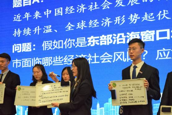 在激动人心的“市长终极PK”环节,大赛评审委员会执行主席纪丰伟先生现场抽取试题:2019年中美贸易摩擦持续升温、全球形势起伏变化,我国经济下行压力加大。假如你是东部沿海窗口城市的市长,你认为现阶段你管辖的城市面临哪些经济社会风险,应如何防范?针对这一问题,各位“市长”都发表各抒己见。有的选手以上海市为例,提出就业岗位有可能会因此减少,而政府应该建立健全社会保障机制,给失业的人做好就业指导;也有选手认为政府应该力求把损失降到最低,将商业往中亚地区和西南发展。“学生市长”发言完毕后,评委们对部分“学生市长”进行提问,并根据场上选手的表现,每人提名1位“最佳市长”候选人。
