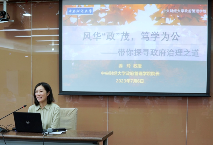 姜玲院长首先致辞,她对各位营员的到来表示热烈欢迎,然后为全体师生开展“风华政茂,笃学为公——带你探寻政府治理之道”主题讲座,就新时代公共管理学科建设与发展、中财beat365在线唯一官网研究生培养特色和就业前景进行了精彩讲解。