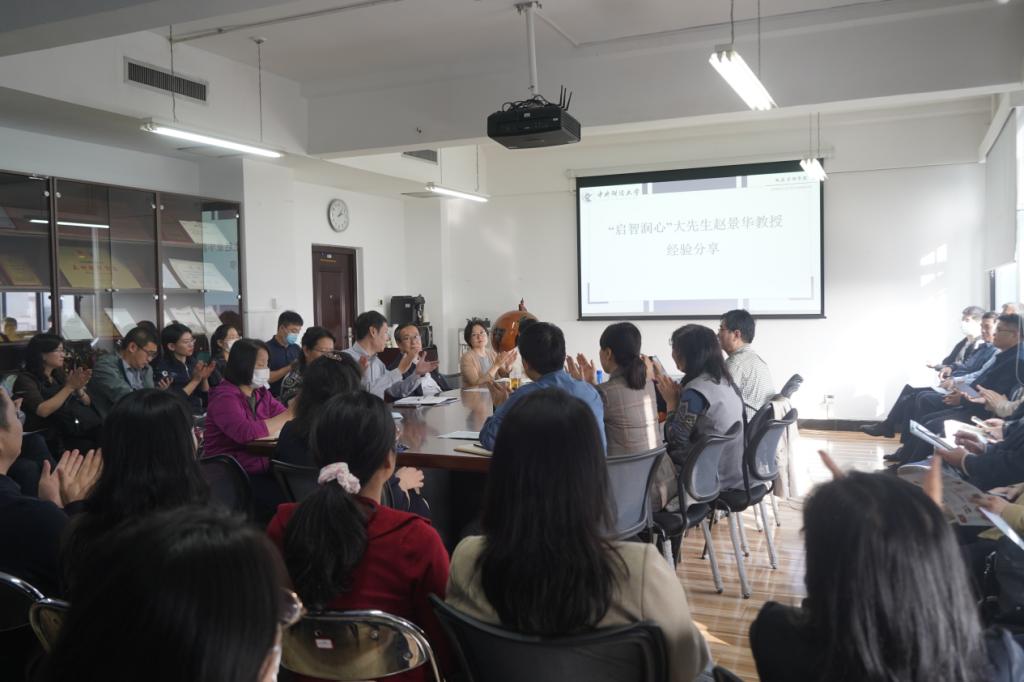 随后,“启智润心”大先生赵景华老师从新时代教师要胸怀“国之大者”、要做真学问、要培养时代需要、人民满意的大学生等三个方面进行了经验分享。赵老师在发言中指出,“国之大者”是关乎国家民族命运的大使命、大格局、大战略,习近平总书记对此提出了殷切期望。新时代的好教师、大先生,做学问要博大精深,要做真学问、求真求实、追求卓越,学院教师应当准确认识世界和中国发展大趋势,做到自身胸怀“国之大者”,也要教育学生胸怀“国之大者”。赵老师提出,建设社会主义现代化强国,实现中华民族伟大复兴需要构建具有自主知识产权的公共管理知识体系,怎样为体系的构建做出贡献是每一位老师、大先生需要思考的问题,怎样培养适合时代需要的、人民满意的大学生、好学生,当中国发展成为世界强国时需要什么样的学生、应该培养什么样的接班人,这需要每一位老师做出贡献。赵老师的经验分享紧密结合习近平总书记的重要指示精神,紧扣新时代公共管理学科特点和人才培养目标,站位高远、思想深邃,引发了与会教师的情感共鸣与深入思考。