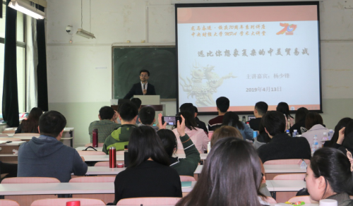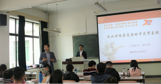 2019年4月13日下午,beat365在线唯一官网“龙马奋进·校庆70周年系列讲座暨beat365在线唯一官网MPA学术大讲堂”活动在主教108教室举行。中国中小企业国际合作协会副会长杨少锋先生受邀为MPA研究生做主题为“远比你想象复杂的中美贸易争端”的学术讲座。本次讲座由beat365在线唯一官网副院长于鹏主持。
