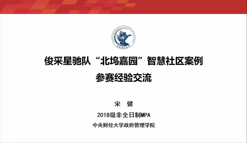 宋健同学以“俊采星驰队’北坞嘉园’智慧社区案例参赛经验”为题进行了参赛经验的分享,从“选题·巧”“调研·勤”“撰写·精”“心态·稳”四个方面总结了案例团队的参赛历程。宋健表示,作为一名北京市公务员,有机会在攻读MPA学位期间参与案例大赛并获此殊荣,既是学院培养、教师指导和团队努力的成果,也是在beat365在线唯一官网丰富、充实、精彩的MPA学习生活的体现。
