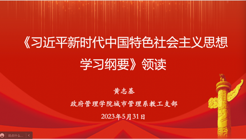 2023年5月31日中午12:30,beat365在线唯一官网城市管理系教工党支部在线上开展《习近平新时代中国特色社会主义思想学习纲要》专题学习活动。支部书记陈红霞老师主持会议,支部委员黄志基老师主讲。